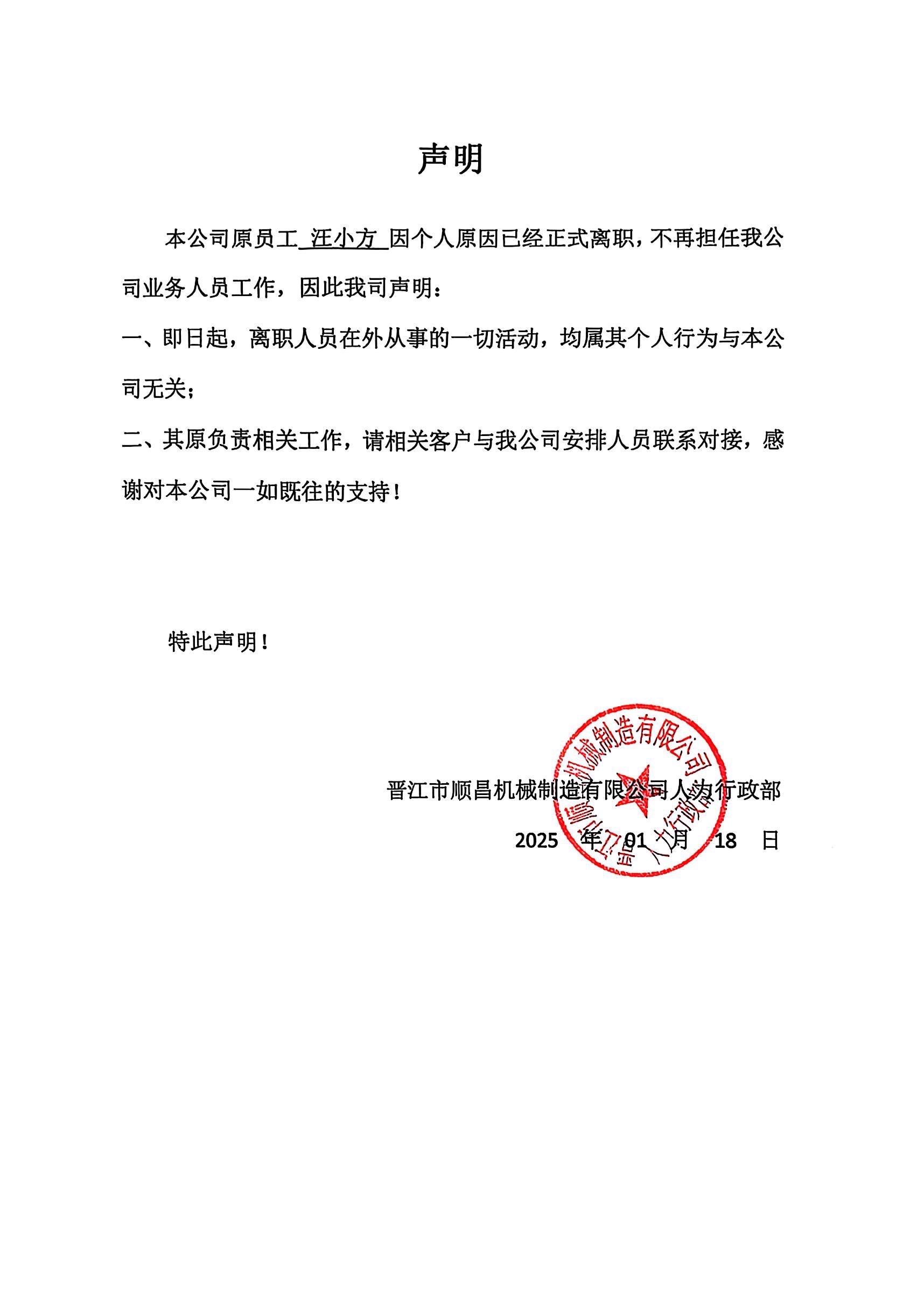 關(guān)于業(yè)務(wù)人員汪小方離職聲明